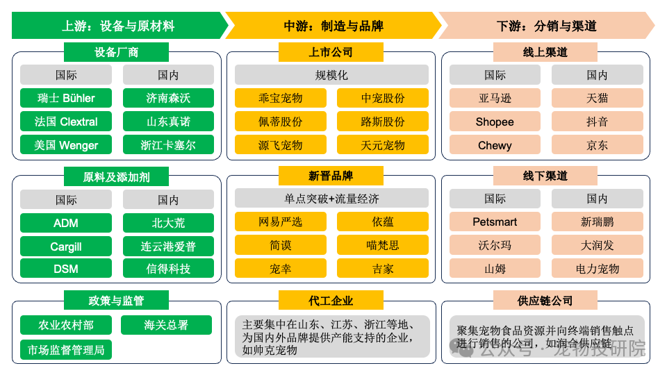 在过去二十年的发展中,宠物食品始终是国内宠物行业最具确定性的增长赛道,而这个赛道事实上是由“设备/原料—制造—品牌—渠道”串联起来的工业化链条。那么,这个链条的结构如何?谁更有定价权?我们来展开分析