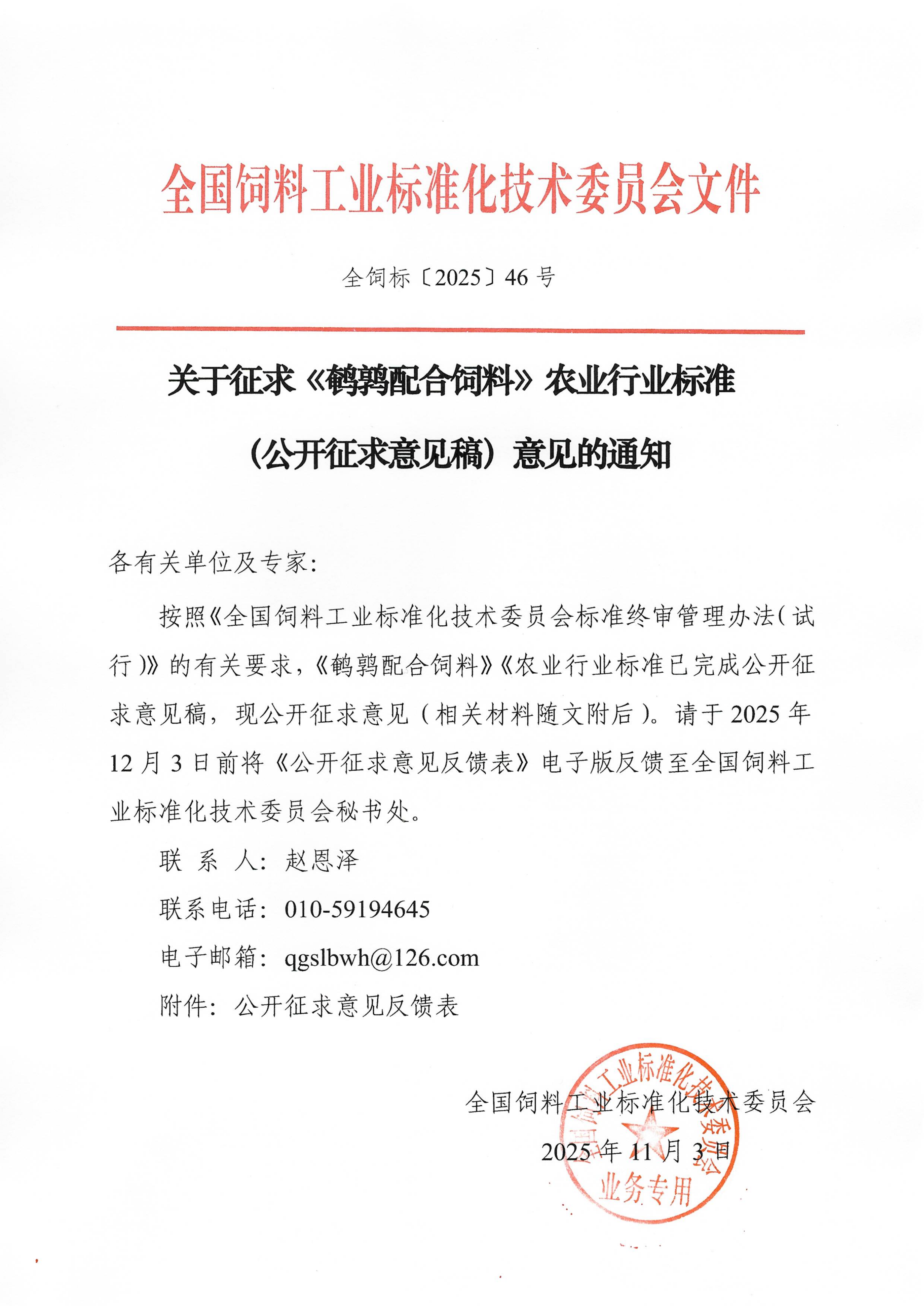 关于征求《鹌鹑配合饲料》农业行业标准(公开征求意见稿)意见的通知