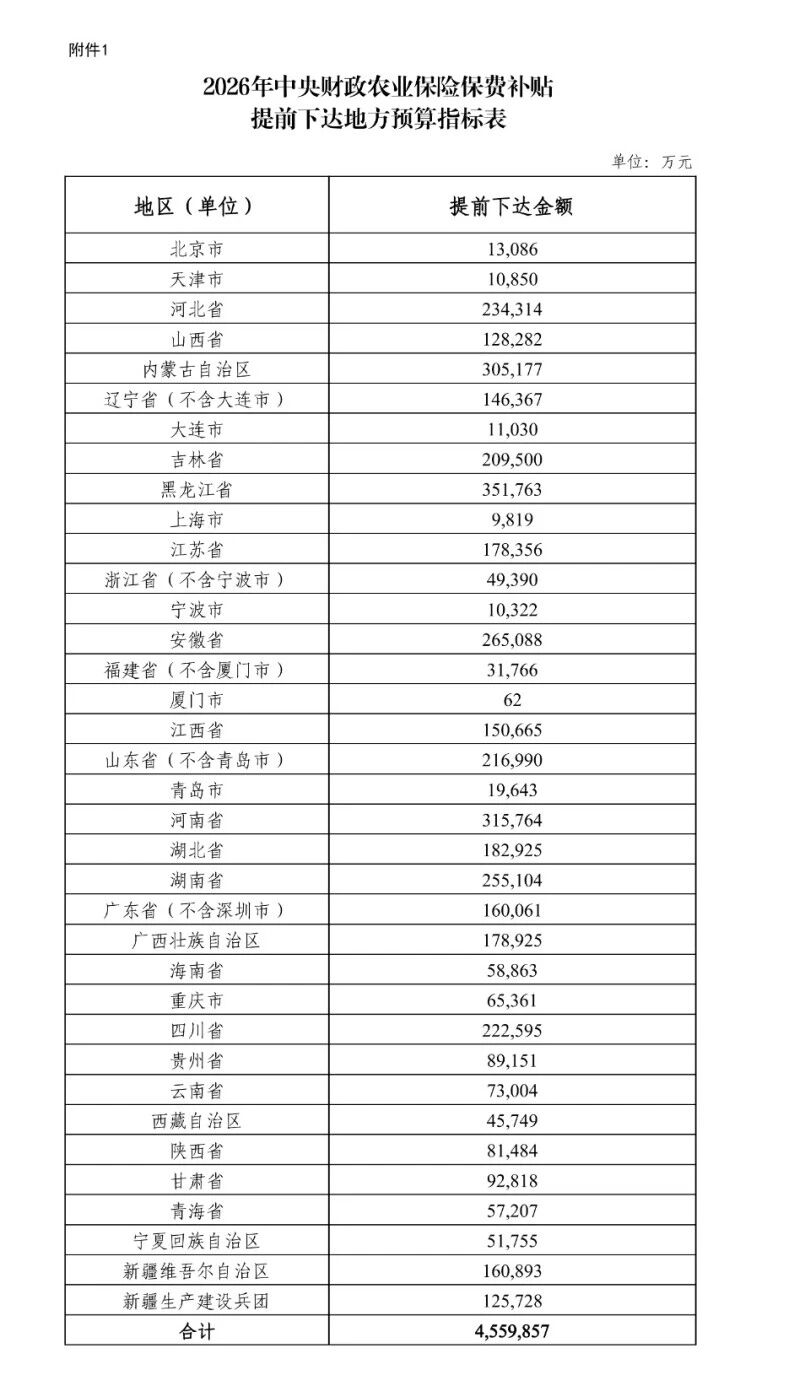 为支持农业保险发展,更好服务保障国家粮食安全,财政部发布通知,提前下达中央财政农业保险保费补贴2026年预算约456亿元。