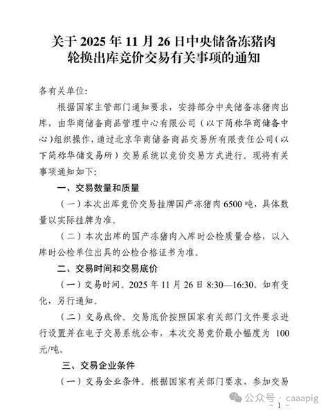 中新经纬11月20日电 华储网20日发布《关于2025年11月26日中央储备冻猪肉轮换出库竞价交易有关事项的通知》称,本次出库竞价交易挂牌国产冻猪肉6500吨,具体数量以实际挂牌为准。通知显示,交易时间为2025年11月26日8:30-16:30。如有变化,另行通知。交易底价按照国家有关部门文件要求设置,并在电子交易系统公布。