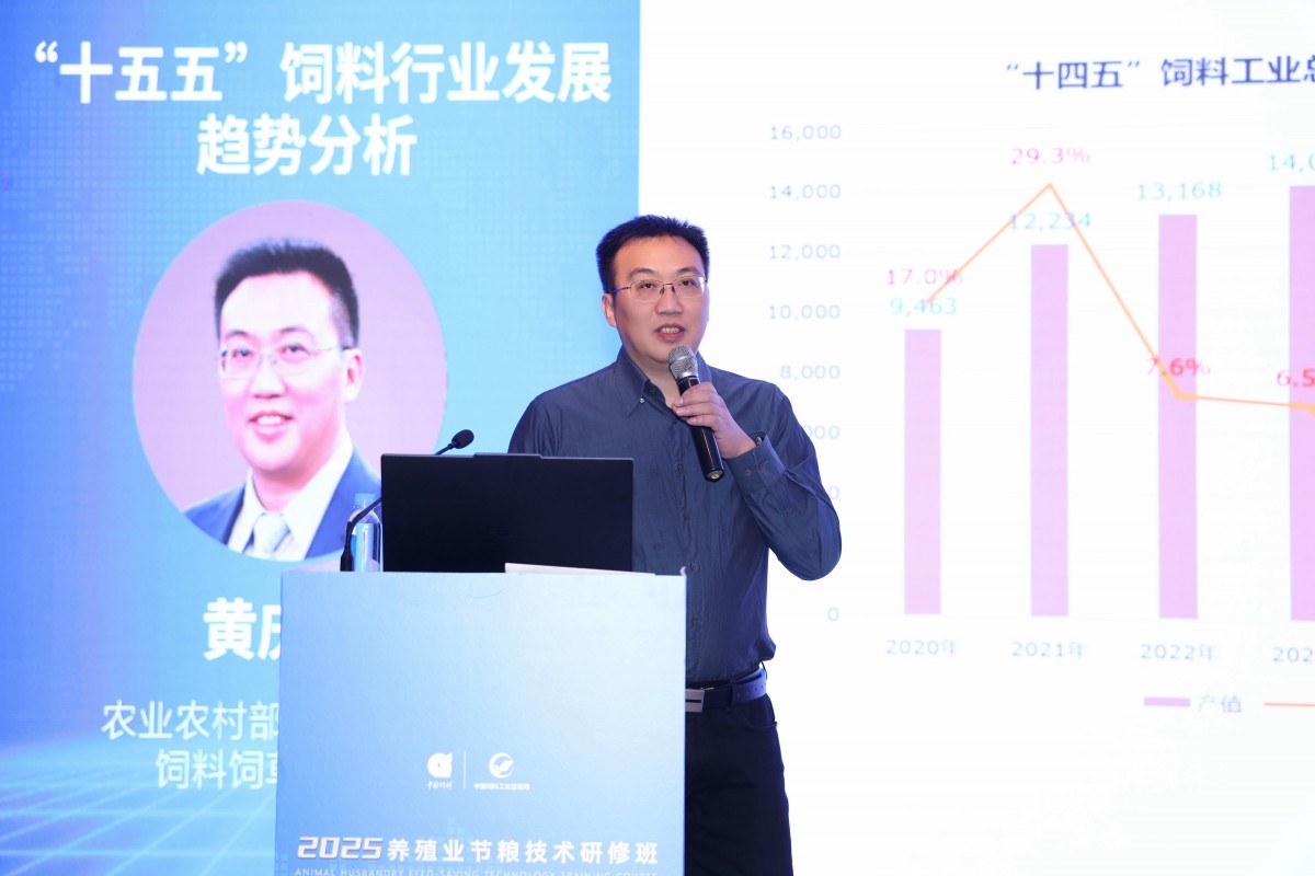 农业农村部畜牧兽医局饲料饲草处处长黄庆生以《“十五五” 饲料行业发展趋势分析》为题授课,为行业高质量发展指明方向。他回顾了“十四五”饲料行业的显著成就:全国工业饲料年产值与产量保持高位稳定,产业集中度持续提升、生产效益稳步增长,新技术与新产品创新步伐加快;同时养殖业饲料蛋白转化效率不断提高,饲料粮用量占比逐步下降,为节粮工作奠定了坚实基础。研判 “十五五” 趋势时,他指出,动物产品需求的持续增长将加剧饲料粮压力,这需国家、行业、企业协同应对 —— 国家聚焦安全与质量,行业侧重效益与创新,企业关注动物健康与效率。他强调要发挥市场与政府协同作用,市场对接养殖提质等需求,政府优化评审与监管。