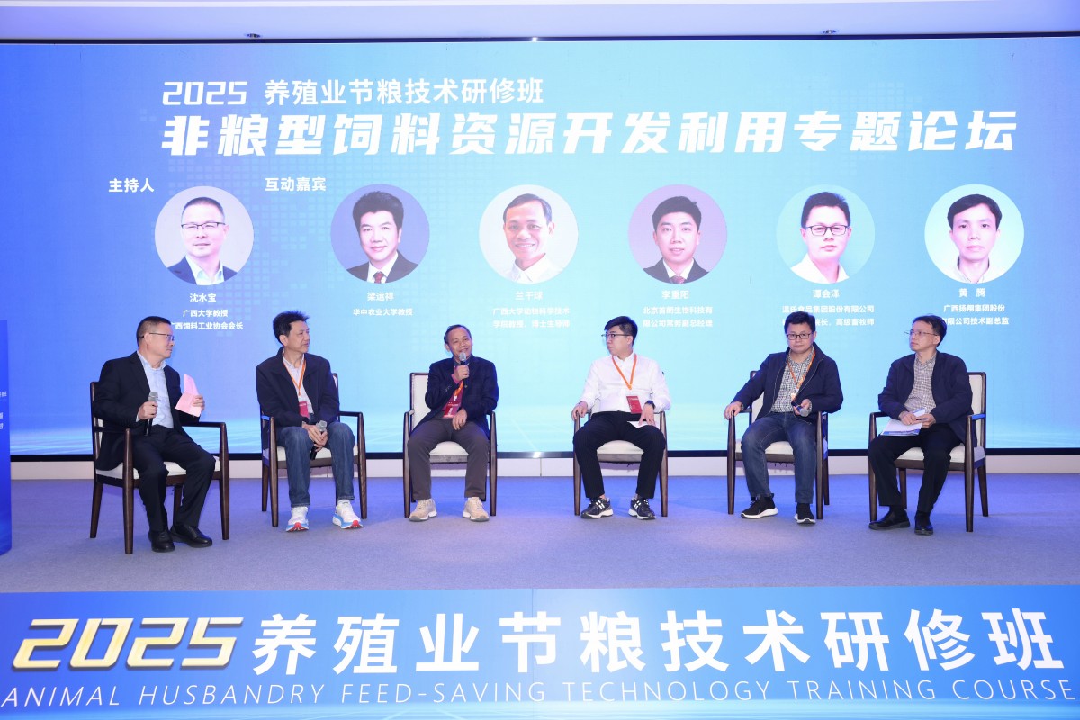 专题论坛环节,在沈水宝教授的主持下,华中农业大学教授梁运祥、广西大学动物科学技术学院教授兰干球、北京首朗生物科技有限公司常务副总经理李重阳、温氏食品集团股份有限公司研究院副院长谭会泽、广西扬翔集团股份有限公司技术副总监黄腾5位嘉宾围绕“非粮型饲料资源开发利用”展开深度对话。讨论直击技术转化难点、政策落地需求及产业链上下游协同痛点,为破解 “人畜争粮” 难题提供了贴合产业实际、具备可操作性的新思路、新路径。