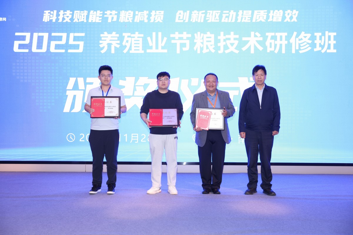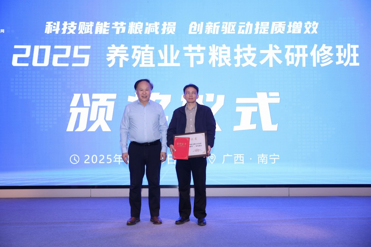 为推动行业在养殖节粮技术中的探索与创新,本次研修班专门设置表彰环节,对节粮技术推广成效突出的先进单位予以表彰,树立行业学习典范。谯仕彦院士与秦玉昌副会长共同为获奖企业颁发荣誉证书,并同获奖代表合影留念。