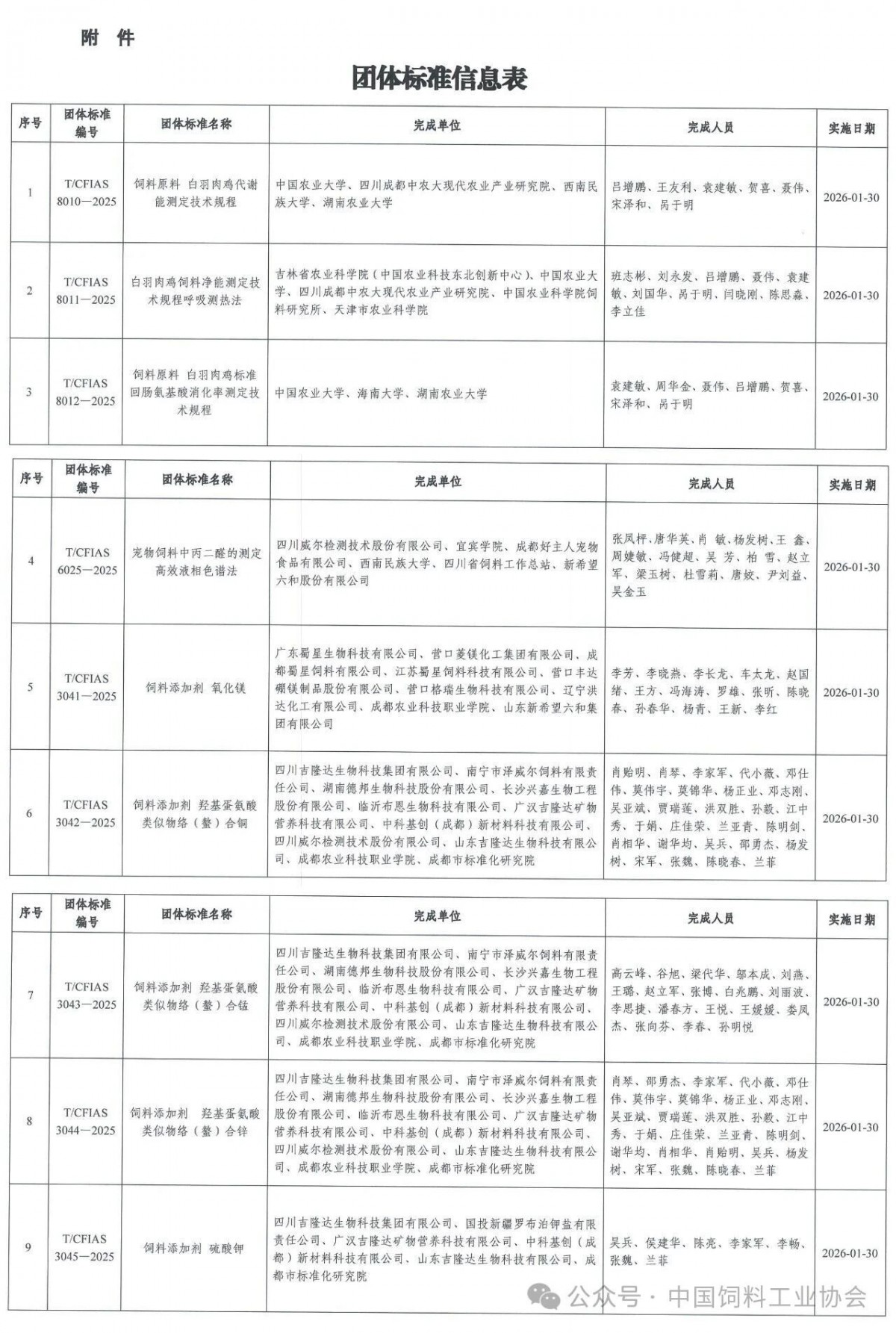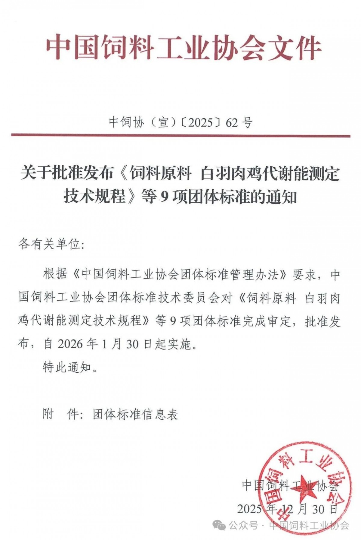 团体标准 | 关于批准发布《饲料原料 白羽肉鸡代谢能测定技术规程》等9项团体标准的通知