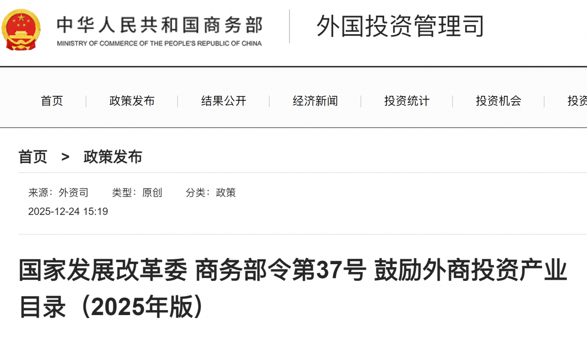 近日,经国务院同意,国家发展改革委、商务部全文发布《鼓励外商投资产业目录(2025年版)》(以下简称《鼓励目录》),自2026年2月1日起施行。