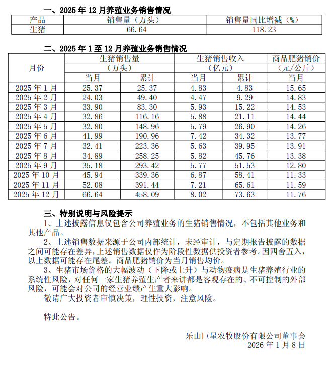 乐山巨星农牧股份有限公司(以下简称“公司”)现将 2025 年 12 月养殖业 务销售情况披露如下: