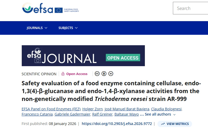 2026年1月8日,欧盟食品安全局就一种由纤维素酶、内切-1,3(4)-β-葡聚糖酶和内切-1,4-β-木聚糖酶组成的食品酶的安全性评价发布意见。据了解,这种食品酶是由非转基因里氏木霉菌株AR-999生产的,旨在用于11种食品生产过程。