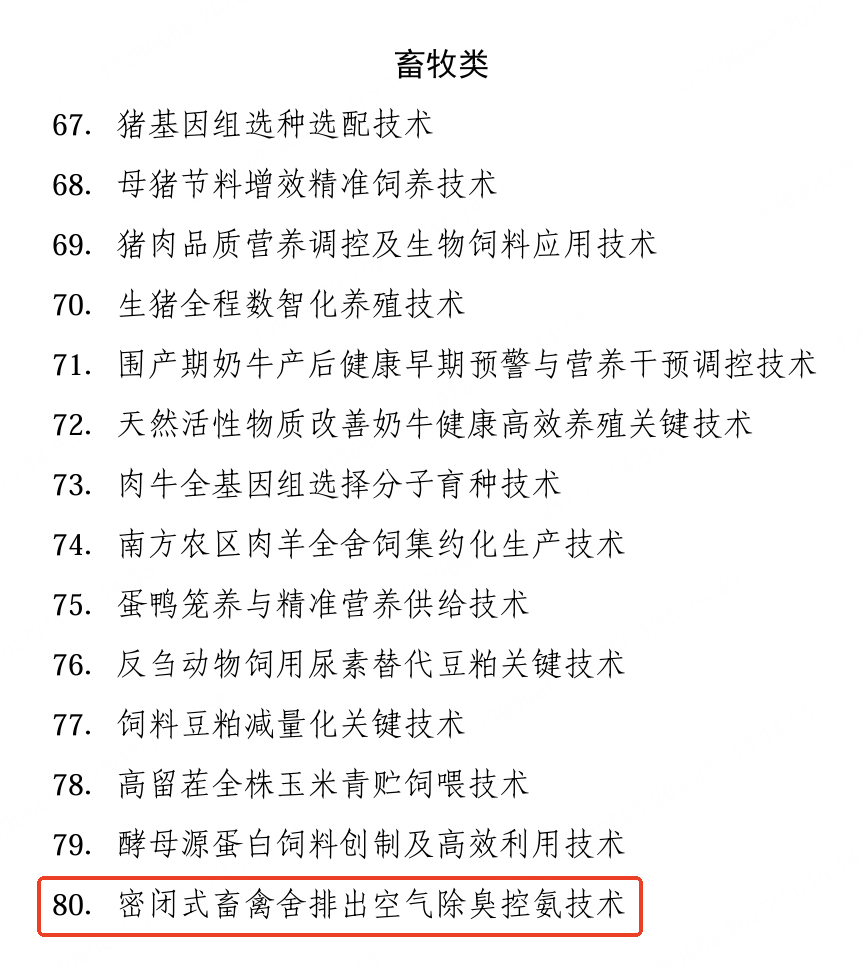 “密闭式畜禽圈舍排出空气除臭控氨技术”入选2025年农业主推技术,为养殖业除臭控氨技术赋能
