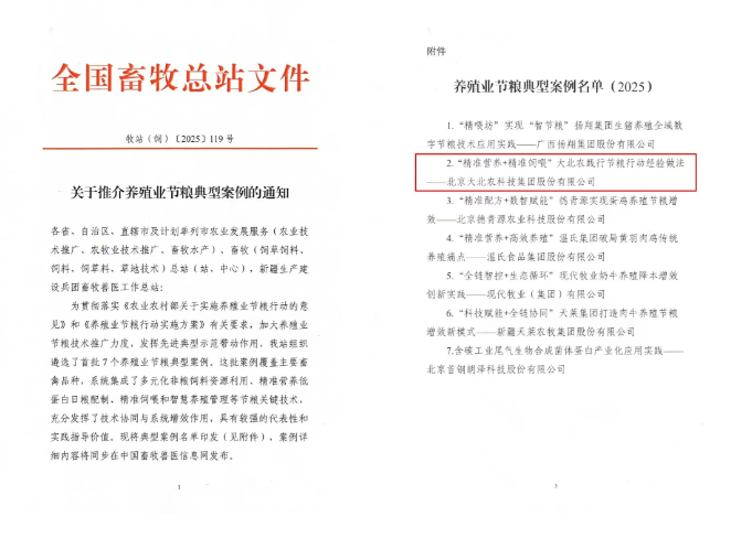 近日,全国畜牧总站印发《关于推介养殖业节粮典型案例的通知》(牧站(饲)〔2025〕119号),正式公布2025年国家养殖业节粮典型案例名单。大北农集团申报的《“精准营养+精准饲喂”大北农践行节粮行动经验做法》成功入选,标志着集团在推动生猪养殖节粮降耗、降本增效方面的创新实践获得国家认可。