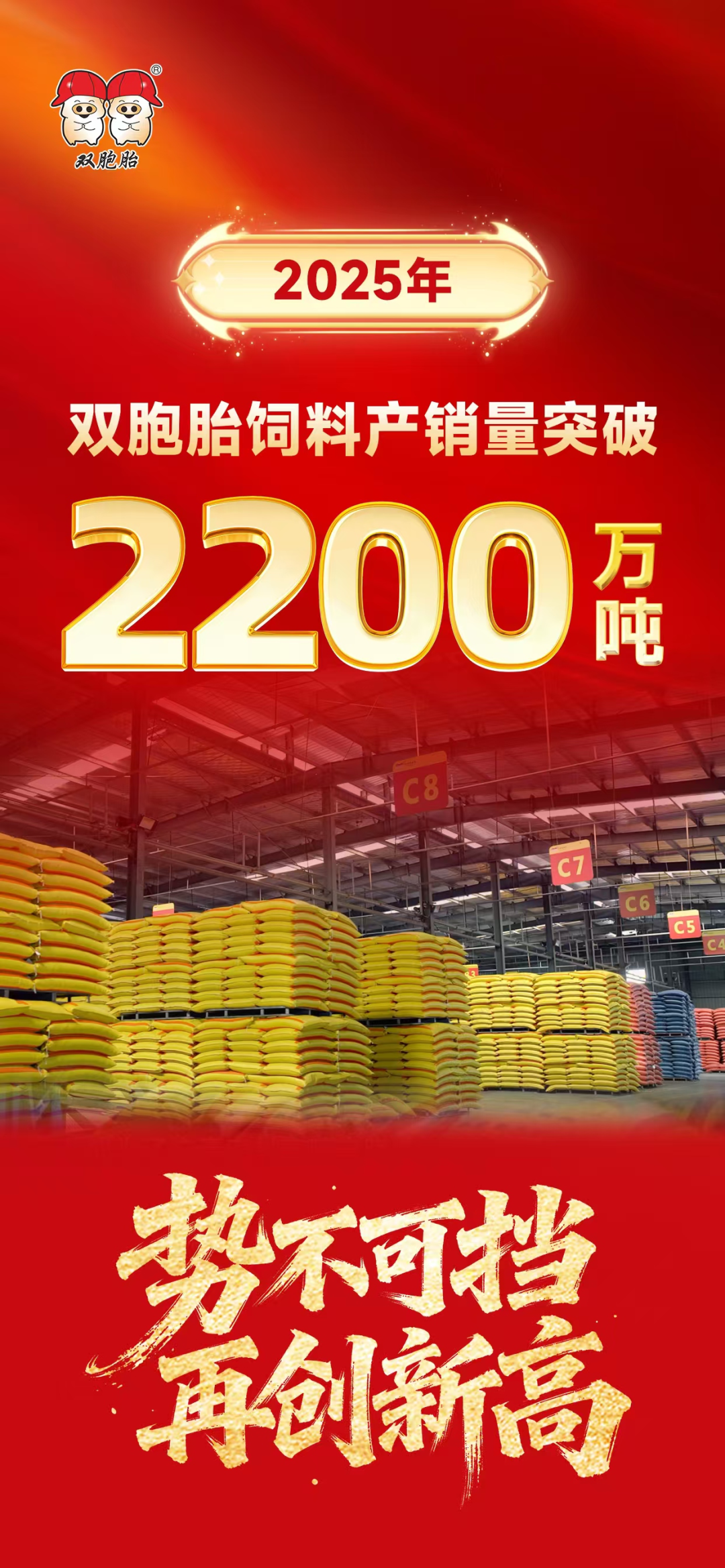 新春伊始,万象更新。在这生机勃发的时节,双胞胎饲料携2025年的优异成绩昂首步入新征程。回望2025年,双胞胎饲料产销量一举突破2200万吨,以势不可挡的发展劲头持续攀登高峰,在中国饲料工业的宏伟长卷上,写下属于双胞胎饲料的时代华章!
