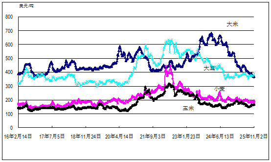1. 多种大宗农产品价格上涨。美国芝加哥商品交易所大豆、小麦和玉米最近期货合约收盘周均价每吨分别为398美元、194美元和170美元,环比分别涨5%、4%和2%,同比分别高11%、低7%和高5%;国际棉花价格指数(SM级)每磅75.80美分(每吨1642美元),环比涨2%,同比低8%;泰国100%B级和5%破碎率大米曼谷离岸周均价每吨分别为370美元和355美元,环比均涨1%,同比分别低30%和31%。
