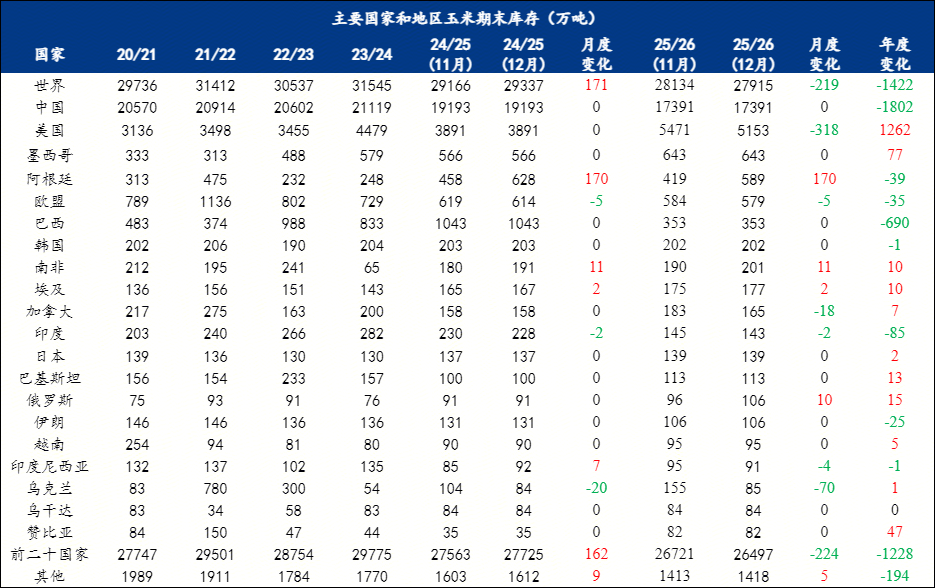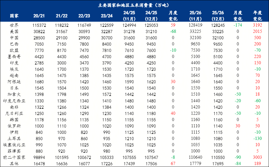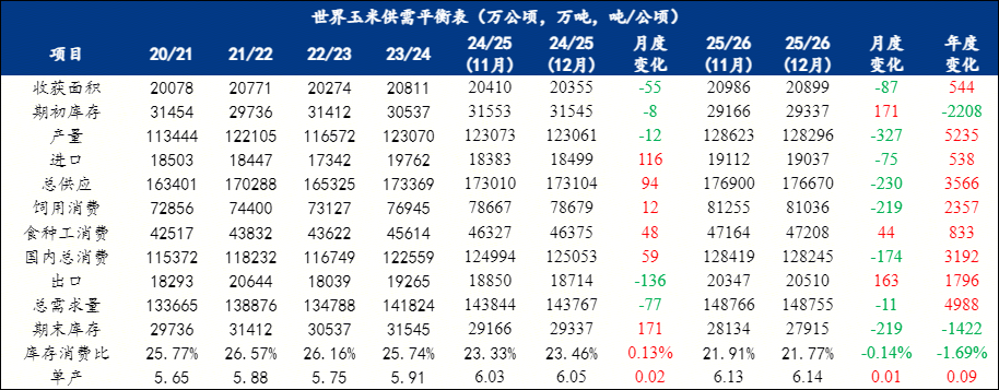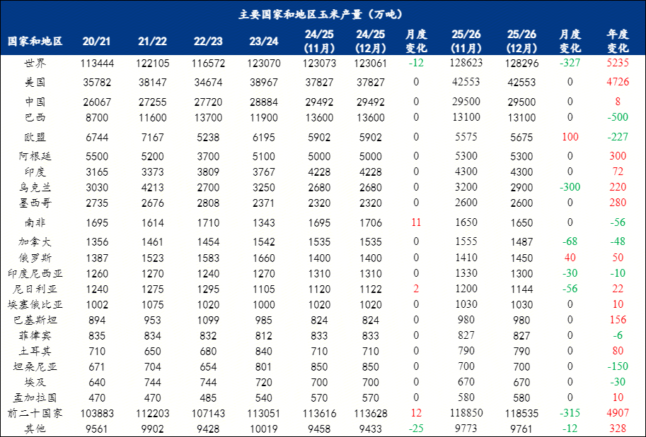 月度变化(2025/2026年度):世界玉米产量较11月预估调减327万吨,至12.83亿吨。主要调整包括:欧盟产量调增100万吨(至5675万吨),而乌克兰产量大幅调减300万吨(至2900万吨),加拿大(-68万吨)与印度尼西亚(-30万吨)等地产量也有所下调。前二十国家总产量相应调减315万吨,至11.85亿吨。