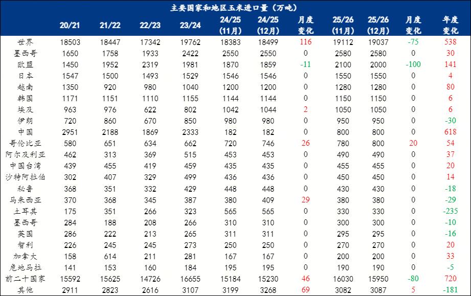 月度变化 (2025/2026年度):世界玉米进口量较上月预估调减75万吨,至1.90亿吨。主要调整包括:欧盟进口量调减100万吨,至2000万吨。前二十国家和地区总进口量较上月预估调减80万吨,至1.60亿吨。
