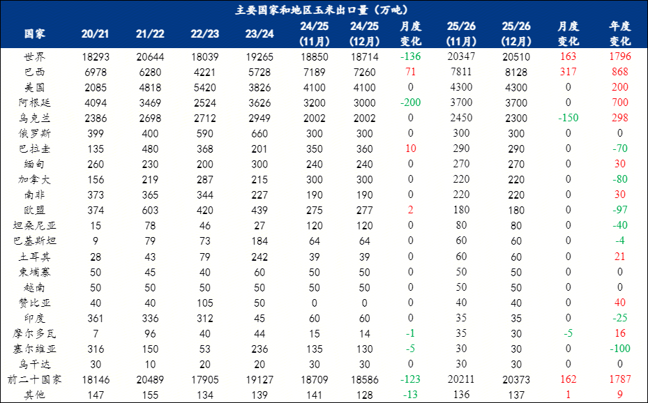 月度变化(2025/2026年度):世界玉米出口量较上月预估调增163万吨,至2.0510亿吨。主要驱动因素为巴西调增317万吨(至8128万吨);但部分国家出口预估调减,如乌克兰调减150万吨(至2300万吨)。前二十国家和地区总出口量较上月预估调增162万吨,至2.0373亿吨。