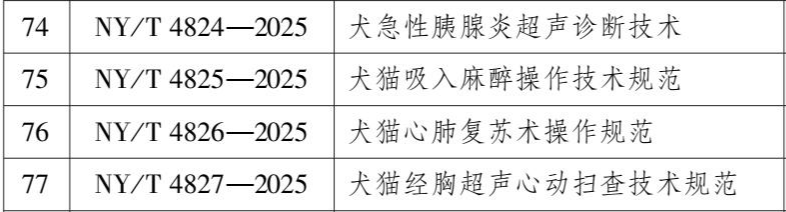 NY/T 4827-2025《犬猫经胸超声心动扫查技术规范》:规定了犬猫经胸超声心动扫查的扫查前准备、扫查流程的技术要求。助力兽医准确评估犬猫心脏结构与功能,早期发现心脏疾病,为宠物心血管疾病诊疗提供技术支撑。