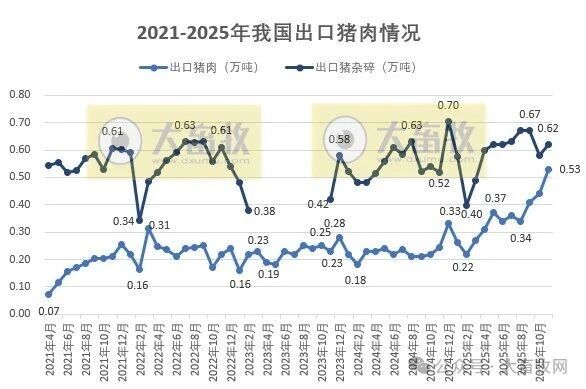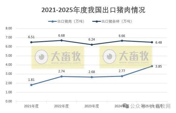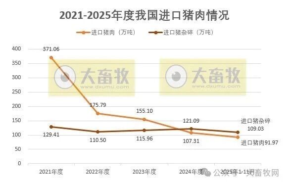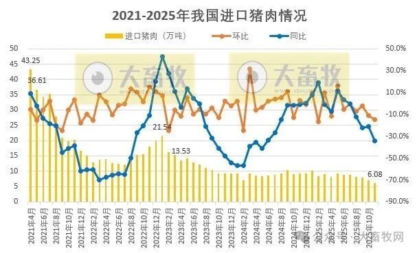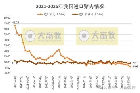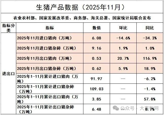 根据五部委发布的数据显示,2025年11月我国猪肉进口量同环比继续减少,猪杂碎进口量同环比出现增长,其中11月猪肉进口量创新低,而前11月进口量同比均减少;