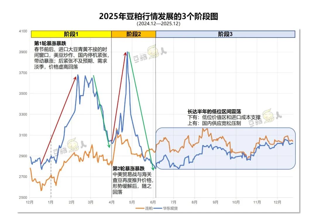 继2024年连续重挫之后,2025年连粕整体维持宽幅震荡,豆粕现货则呈现出 “冰火两重天”的态势:上半年暴涨暴跌,上演了波澜壮阔的剧情,下半年则归于平静,在历史低位区长时间徘徊,这种沉寂格局,还要多久打破?“豆粕人”重点围绕豆粕现货,把今年的行情划分为3个阶段进行梳理,欢迎国内油脂、饲料、贸易和养殖企业,观看和深度研究。