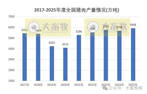2025年,全国猪肉产量为5938万吨,增加232万吨,增幅为4.1%,猪肉产量创历史新高,首次突破5900万吨。