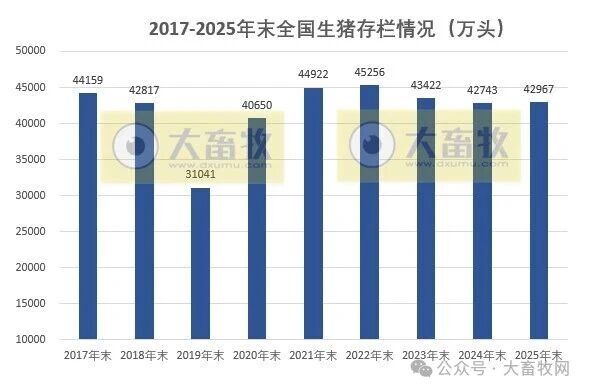 2025年末,全国生猪存栏为42967万头,比上年末增加244万头,增幅为0.5%,近5年仅高于2024年;