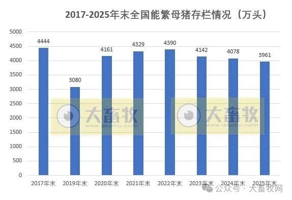 其中,2025年末,全国能繁母猪存栏为3961万头,同比减少116万头,降幅为2.9%,目前为正常保有量的101.6%,连续3年下降,不仅是近6年最低存栏量,还降至4000万头以下。