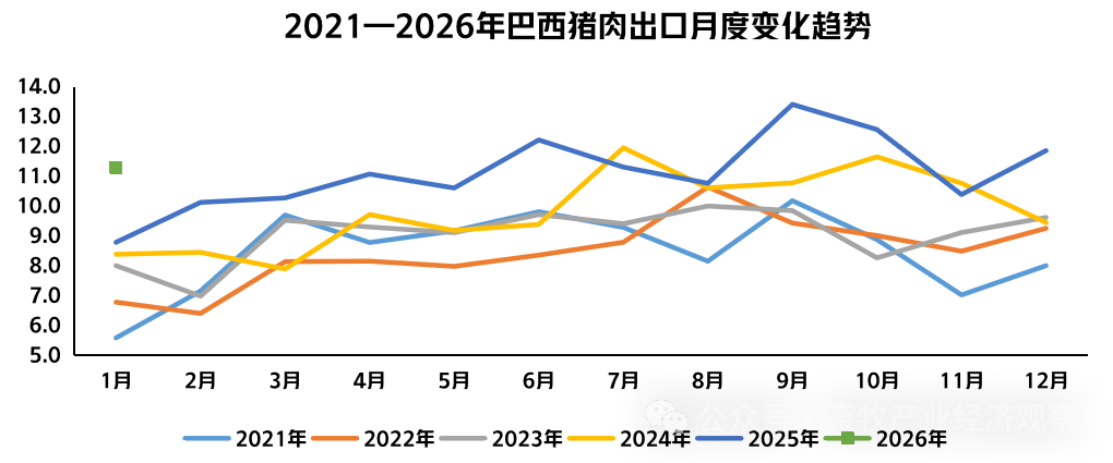 贸易方面,1月份巴西猪肉出口同比增长。从巴西看,1月份猪肉出口11.3万吨,同比增28.5%。其中,对华出口0.8万吨,同比降57.7%。