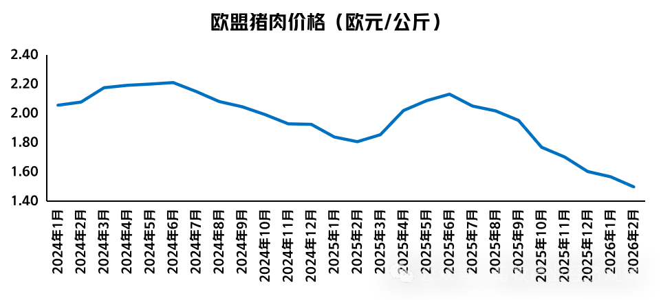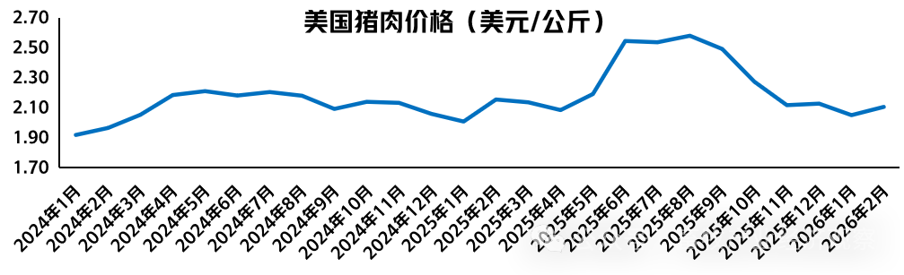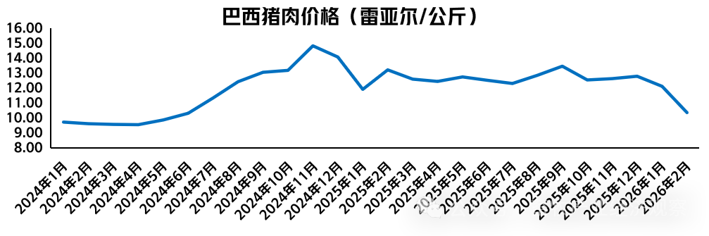 价格方面,2026年2月美国猪肉价格为2.11美元/公斤,同比下跌2.3%;折人民币价格为14.56元/公斤。巴西猪肉价格为10.36雷亚尔/公斤,同比下跌21.6%;折人民币价格为13.75元/公斤。欧盟猪肉价格为1.50欧元/公斤,同比下跌17.1%;折人民币价格为12.24元/公斤。