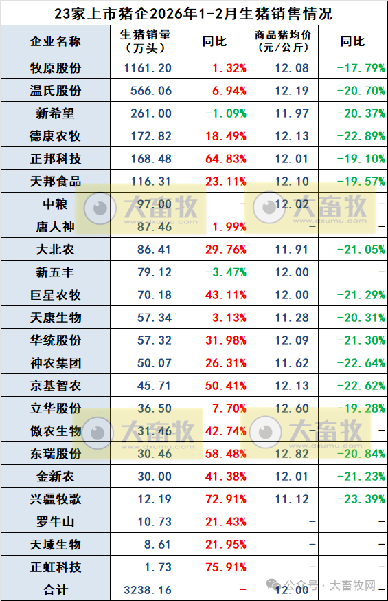 近日,牧原、温氏、新希望、德康、正邦和天邦等23家上市猪企发布2026年2月生猪销售情况,1-2月生猪销售量同比以增长为主,商品猪销售均价均双位数下跌,具体情况如下: