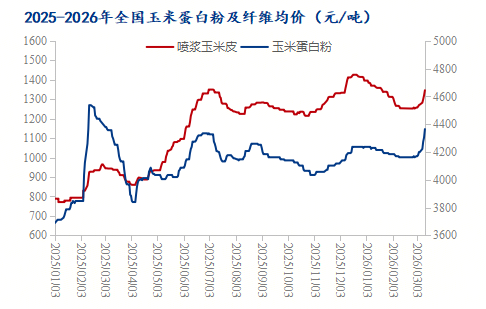 与此同时,作为玉米蛋白粉的直接生产原料,玉米价格同样维持偏强走势。基层余粮逐步见底,优质粮源紧俏,贸易商存粮意愿较高,出货较少。深加工企业库存低,收购积极性较高玉米收购均价稳步上行,深加工企业采购成本持续走高。成本端压力直接传导至玉米蛋白粉产品端。在豆粕价格居高不下的背景下,玉米蛋白粉初期蛋白替代优势凸显,下游饲料企业纷纷加大玉米蛋白粉采购力度,叠加“买涨不买跌”的市场心态,华北及东北区域下游补单情绪升温、市场成交活跃度大幅提升。多重利好加持下,玉米蛋白粉价格涨势迅猛,按周度均价来看,一度攀升至4365元/吨,较月初涨幅近5%,厂家报价接连上调,市场看涨氛围浓厚。