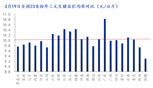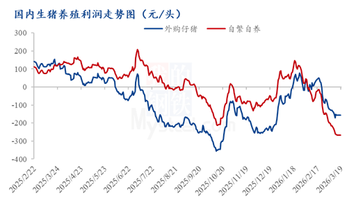 进入3月份,国内生猪价格跌后持续低位震荡。月初东三省及新疆率先破”10”,后华北、华中、西南、西北多省相继进入4元区”(元/斤) 。生猪行业持续低迷,出栏亏损不断加剧。截至19日全国外三元生猪出栏均价仅为9.95元/公斤,创近十年来数据新低。从供需结构看,2025年能繁母猪存栏高位对应2026 年一季度集中出栏,叠加规模场出栏计划增加、大猪标肥价差手指,供应节奏加快进一步压制猪价,市场二育及放养公司补栏谨慎难明显带动。尽管局部出现惜售与收储托底信号,但短期供需失衡难以扭转,猪价仍以磨底运行为主,反弹乏力,市场信心持续偏弱。