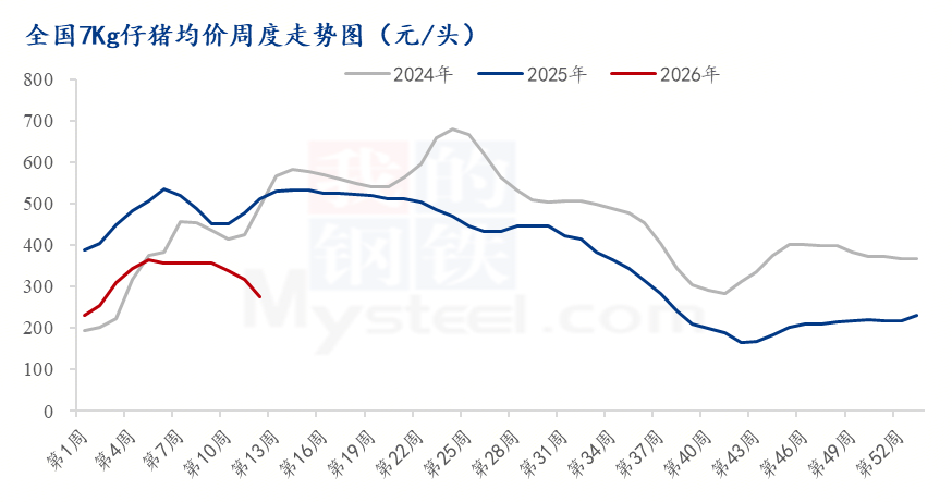 在商品猪价格持续深跌的拖累下,仔猪市场也在预期需求即将转旺时连续回落。3月份仔猪价格也结束了此前的相对抗跌态势,转而步入下行通道。截至3月中旬,7公斤断奶仔猪头部猪企报价跌至320元/头,但市场实际成交基本在240-280元/头,部分或更低。较年内高点明显回落,同比降幅超过40%。按照行业断奶仔猪成本280元/头(规模场成本多处250-300元/头)测算,当前仔猪外销利润已被压缩至无力或微利状态。
