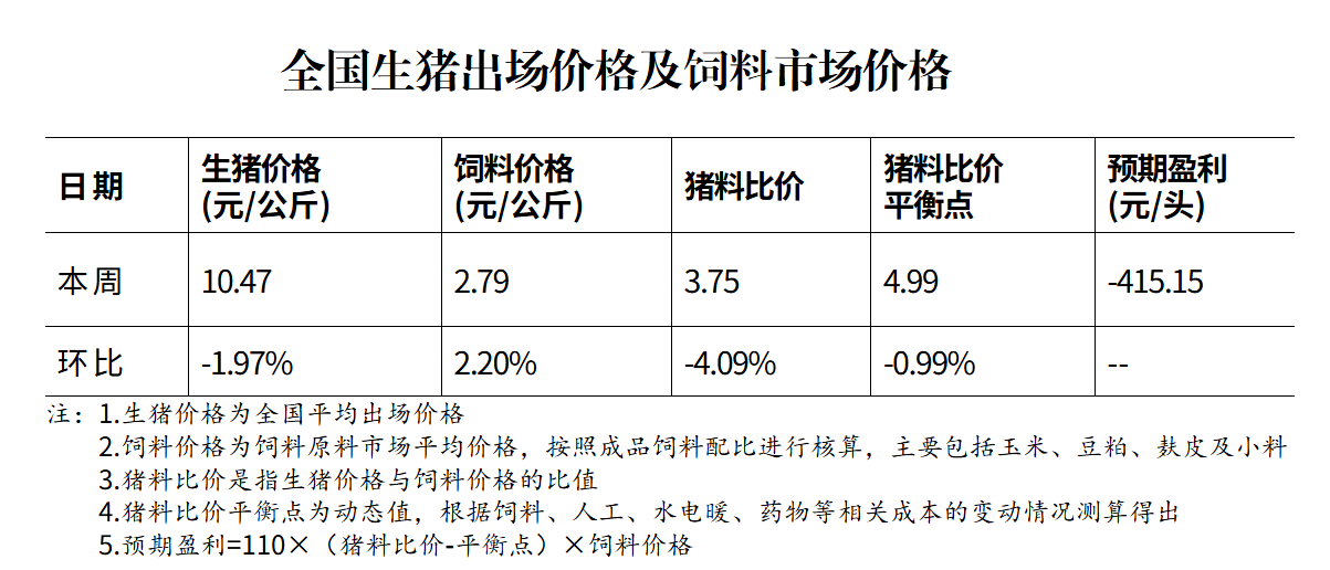 本周全国猪料比价为3.75,环比下跌4.09%。按目前价格及成本推算,未来仔猪育肥模式的生猪养殖头均盈利为-415.15元。本周生猪均价环比下滑。中大型养殖企业继续加速出栏,但终端市场需求平淡,且屠宰企业冻品入库及二次育肥补栏均维持谨慎,需求消化能力有限,供大于求带动生猪价格继续下跌。目前散户对低价销售已经产生抵触情绪,未来一周大型养殖场减重出栏速度或放缓,且屠宰企业已有低价补库迹象,猪价继续下跌空间不大,或维持低位震荡运行,预计下周生猪均价或环比仍下滑,养殖预期盈利或继续减少。