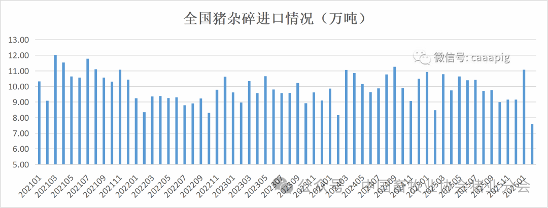 2、2026年2月进口猪杂碎7.59万吨,环比下降31.4%,同比下 降10.6%。