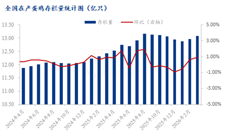 4月份新开产蛋鸡主要为2025年12月份补栏鸡苗,受2025年鸡蛋市场深度亏损影响,去年四季度鸡苗补栏量持续低迷,低于往年同期水平,但12月份补栏量较11月份环比略有恢复,因此4月份新开产蛋鸡数量虽处于偏少水平,但较3月份略有增加,可淘老母鸡对应2024年四季度补栏鸡苗,将在五一前后陆续进入淘汰期,故淘汰量逐步释放,但春节后换羽的老鸡将逐步进入产蛋高峰期,加之当前在产蛋鸡存栏仍维持高位水平,且4月天气转暖,蛋鸡产蛋率稳步提升,综合来看,2026年4月鸡蛋整体供应量预期将保持相对稳定,供给端压力较3月略有缓解,供应结构呈现 “总量充足、边际改善” 的特点。