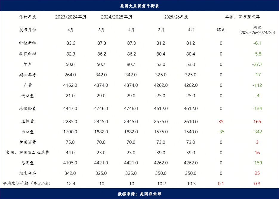 从同比来看,2025/26年度4月数据较2024/25年度同期分化显著:种植面积与收获面积分别同比减少 610 万英亩和 580 万英亩,但单产同比提升 2.3 蒲式耳 / 英亩至 53.0 蒲式耳,部分抵消面积下滑影响,产量同比减少 11200 万蒲式耳至 42620 万蒲式耳;进口量同比减少400万蒲式耳,总供给量同比减少 13400 万蒲式耳;压榨量同比增加 16500 万蒲式耳至 261000 万蒲式耳,下游加工需求强劲,出口量同比大减 34200 万蒲式耳至 154000 万蒲式耳;总用量同比减少 15900 万蒲式耳,期末库存同比增加 2500 万蒲式耳至 35000 万蒲式耳,平均农场价格同比提升 0.3 美元 / 蒲至 10.3 美元 / 蒲。
