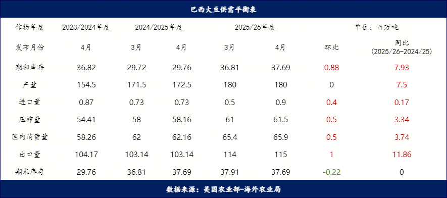 从同比来看,2025/26年度4月数据较2024/25年度同期增长显著:期初库存同比增加793万吨至3769 万吨,为年度供应提供充足缓冲;产量同比增加 750 万吨至 1.8 亿吨,丰产支撑全球供应;进口量同比增加 17 万吨至90万吨,进口规模维持低位;压榨量同比增加334万吨至6150万吨,国内加工需求持续扩张;国内消费量同比增加374万吨至6590万吨,终端消费稳步增长;出口量同比激增1186万吨至1.15亿吨,丰产驱动下出口能力大幅提升,进一步巩固其全球大豆贸易核心地位;期末库存同比持平,在出口放量背景下实现供需紧平衡,显示供应充裕。