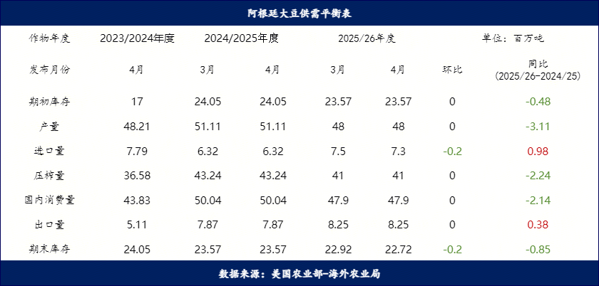 整体来看,2025/26 年度阿根廷大豆供需格局偏紧,减产是核心驱动因素,库存持续去化将对全球大豆供应形成支撑。