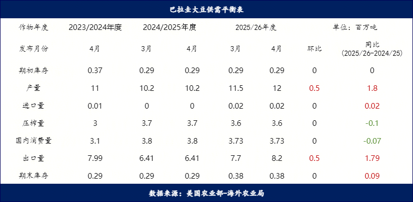 环比变化来看, 2025/26年度4月数据中产量上调50万吨至1200万吨,出口量上调50万吨至820万吨,期初库存、进口量、压榨量、国内消费量及期末库存均维持不变,反映本月对巴拉圭大豆产量与出口的预期有所上调,短期供需预期保持稳定。