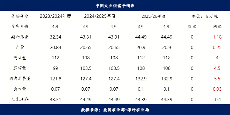 从环比变化看,2025/26年度4月数据较3月无调整:期初库存、产量、进口量、压榨量、国内消费量、出口量及期末库存均维持不变,反映出本月对中国大豆市场的预期未发生波动,短期供需预期保持稳定。