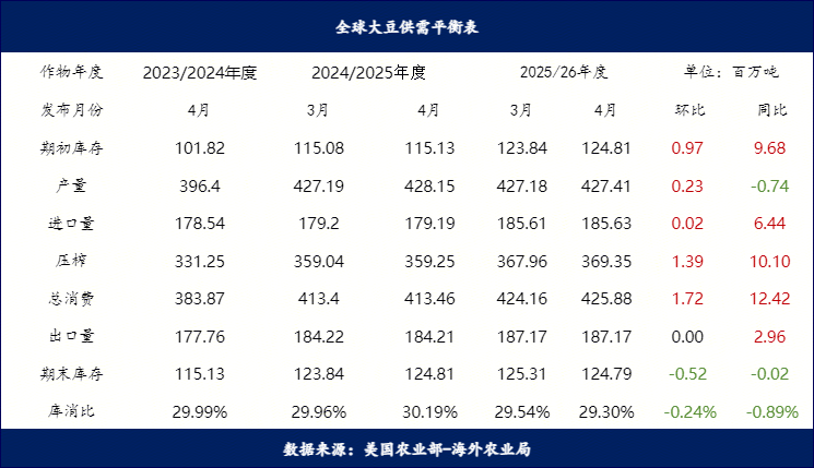 美国农业部近日发布 4 月份供需报告。本次 USDA 月报 2025/26 年度全球大豆供需格局边际收紧,数据对期货走势偏利多,后续市场焦点依旧是全球大豆春季种植意向、美国生物燃料政策、中东局势、商品基金的投资资金流入、跨市场套利、中美贸易谈判等。(下表市场年度的 “环比” 数据是 2025/26 市场年度 4 月数值与 3 月数值对比“,同比”数据是 2025/26 年度和 2024/25 年度的3月数值对比。)