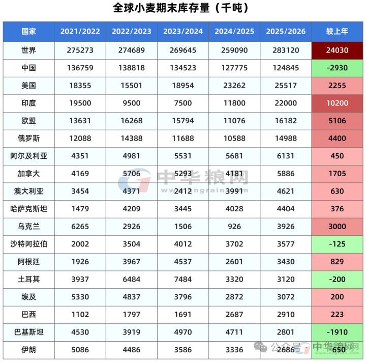 本月预测全球小麦期末库存为2.8312亿吨,较上月调高616万吨,比上年增长2403万吨或9.27%(上月预测增长1733万吨或6.67%)。