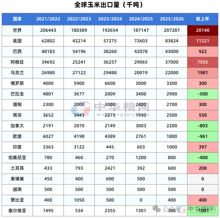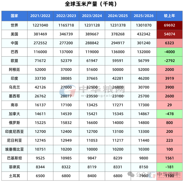 本月玉米产量维持不变的国家包括,巴西玉米产量维持1.32亿吨不变,阿根廷玉米产量也维持5200万吨不变。乌克兰玉米产量维持3070万吨不变。