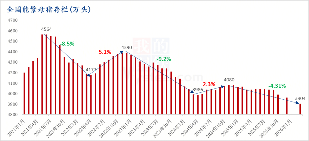 最新官方数据显示,2026年一季度末,全国能繁母猪存栏3904万头,环比减少1.44%,同比下降3.3%。这一数字仅略高于3900万头的传统正常保有量,虽处于产能调控的绿色合理区域,但尚未达到预期缩减目标,是解读本轮猪价反弹及预判下半年行情的核心依据。