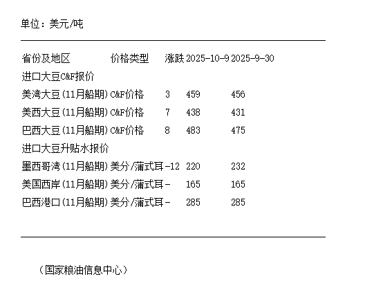 10月9日进口大豆到国内港口C&F及升贴水报价