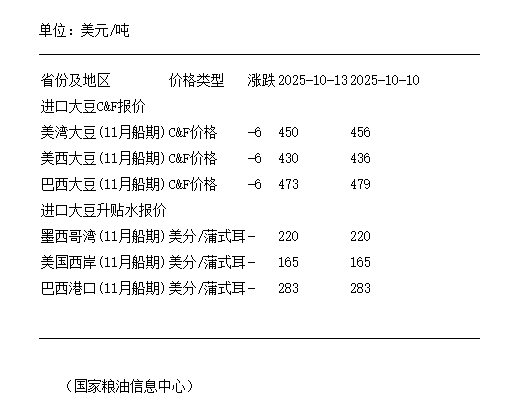 10月13日进口大豆到国内港口C&F及升贴水报价