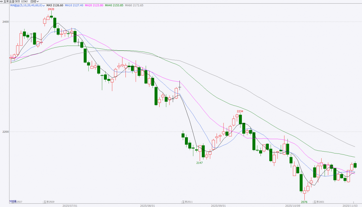 期货市场:11月4日大连玉米合约震荡运行,多数微跌。主力C2601合约收盘价2135元/吨(开盘2143元,最高2146元,最低2133元,结算价2139元),持仓量增9833手至92.7万手,资金净流入2169万元(总持仓资金27.71亿元)。当日成交60.9万手(较上一日减30万余手),多空均增仓:多头主力增7474手至619446手,空头主力增6070手至720494手,空头个别席位增仓明显,显示上方压力增强。