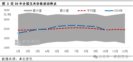 从长周期来看,2025年玉米价格处于近十年同期平均值附近。由于2025年春节前后,各产区基层农户售粮积极性较高,下游加工企业积极备货、国储库收购量增加,1-2月份市场价格呈上涨趋势,但由于供应端增量较明显,价格仍处于近十年同期均值以下;随着基层粮源不断减少,并陆续转移到贸易商环节,市场价格受到成本支撑,4-9月份全国玉米价格整体是上涨趋势,虽10月新粮上市期价格季节性回落,但均高于近十年同期均值。其中5-7月月均价高出近十年同期均值100-110元/吨。8-9月份价格缓慢走低,主要受到进口玉米拍卖的影响,贸易商积极出货,供应量增加,市场价格承压。