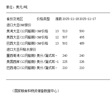 11月18日进口大豆到国内港口C&F及升贴水报价