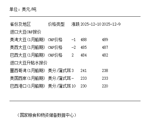 12月10日进口大豆到国内港口C&F及升贴水报价