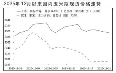 上周(12月15日至19日),国内玉米现货和期货市场价格均有所下降,但玉米现货价格表现更加坚挺,产区跌幅更小。12月19日,产区辽宁锦州港含水14.5%国标二等玉米汇总价2305元/吨,周环比下跌10元/吨;国内玉米现货均价2301元/吨,周环比下跌12元/吨;销区广东蛇口港含水14.5%国标二等玉米价格为2430元/吨,周环比下跌30元/吨;玉米期货主力合约收盘价2192元/吨,周环比下跌50元/吨。