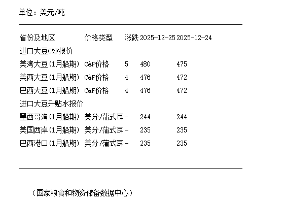 12月25日进口大豆到国内港口C&F及升贴水报价
